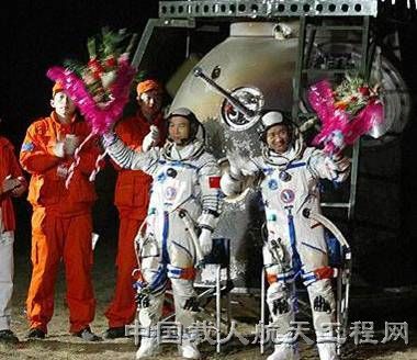 2008年9月25日21时10分,神舟七号飞船在中国酒泉卫星发射中心搭乘长征二号F型运载火箭发射升空,将翟志刚、刘伯明、景海鹏等3名中国航天员送入太空。