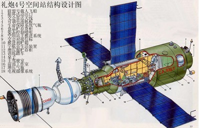 “礼炮2”至“礼炮7”号:苏联的这6个空间站分别于1973年至1982年间发射,最后一个即“礼炮7”号在1991年坠落到地球。“礼炮2”至“礼炮5”号属于第一代空间站,它们每个重量约19吨,长16米,只有一个对接口,可与“联盟”号载人飞船对接。第二代“礼炮6”号及“礼炮7”号空间站对接口增加到两个,可分别与载人和载货用的飞船进行对接。