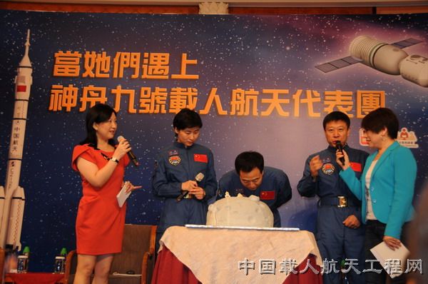 图:香港妇女界送给航天员一份神秘礼物,主持人请航天员猜猜看是什么(刘爽 摄)