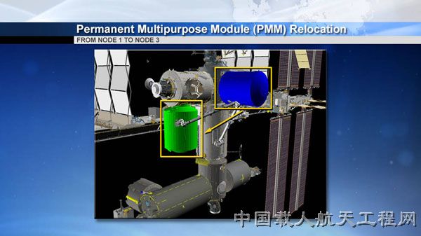 “永久多功能舱(PMM)”被从“团结”号节点舱面向地球的端口拆下,然后安装到附近“宁静”号节点舱的侧面端口,整个操作由NASA约翰逊航天中心遥控指挥机械臂完成,国际空间站航天员负责密切监视操作。