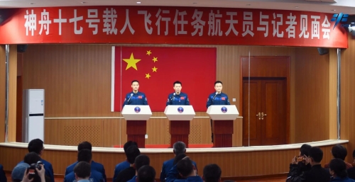 北京时间2023年10月25日11时,汤洪波、唐胜杰、江新林3名乘组航天员在酒泉卫星发射中心问天阁与中外媒体记者集体见面,并回答记者提问。这是神舟十七号飞行乘组的首次亮相。