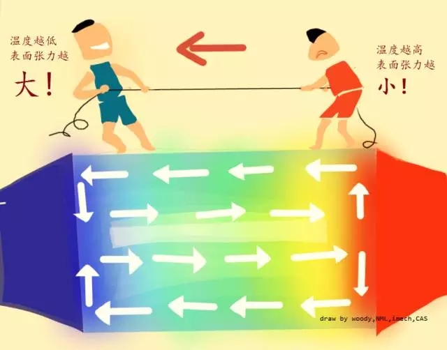 表面张力会随着温度变化,温度高的地方表面张力低,温度低的地方表面张力高,表面张力不均匀成为驱动微重力流动的因素。由于表面张力又称毛细力,所以这种表面张力温度效应驱动流动,又称为热毛细流动,或者叫做Marangoni对流。